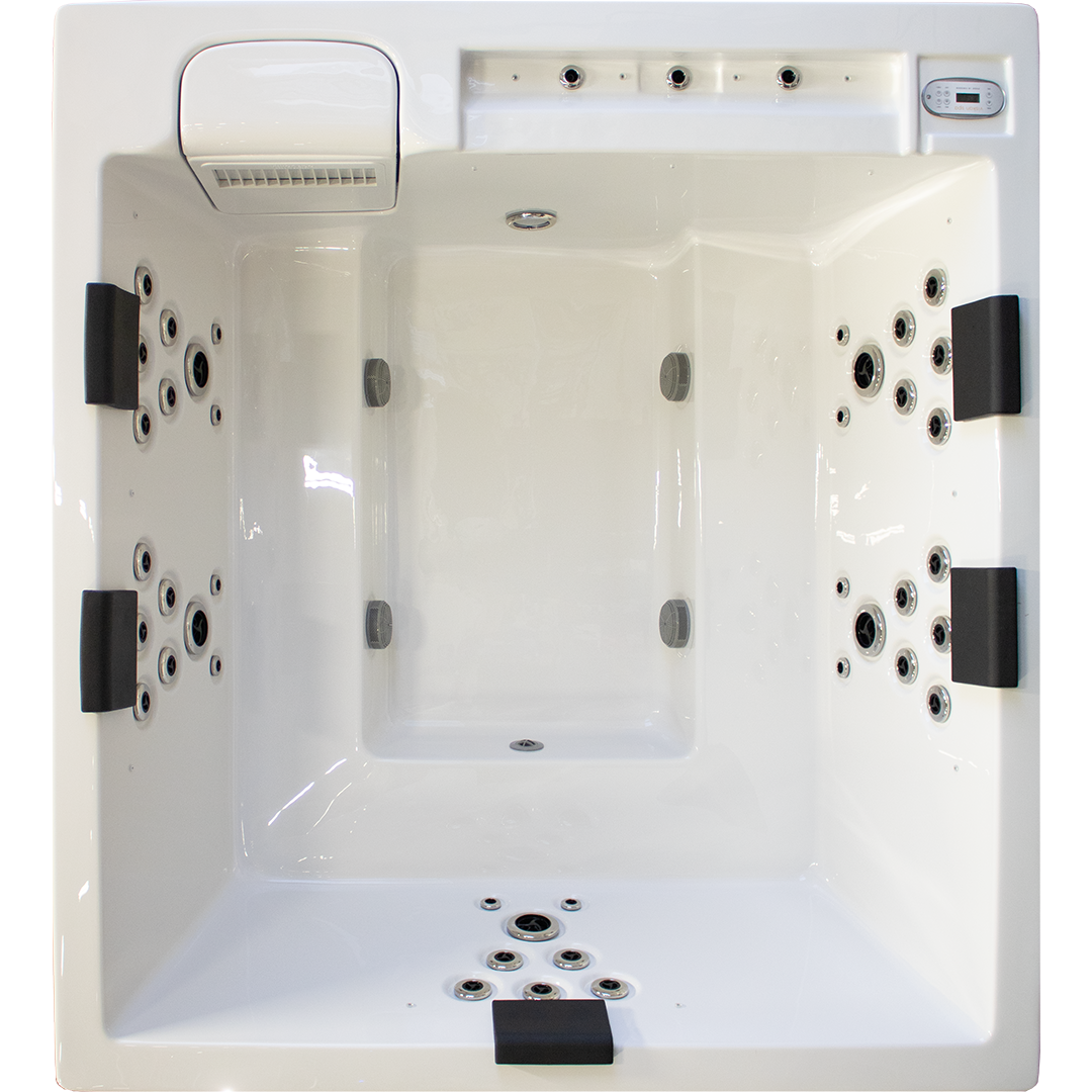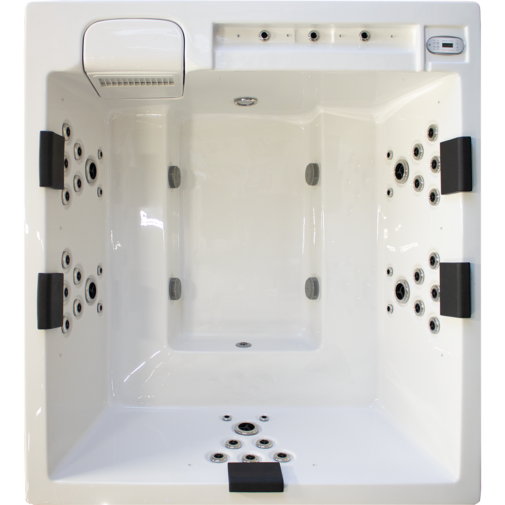 Ett stilrent spabad med fem platser med massagejets och fler platser för avkoppling. Med loungeliknande sittplatser skapas flytande gränser var sittplatserna börjar och slutar och ger plats till fler.